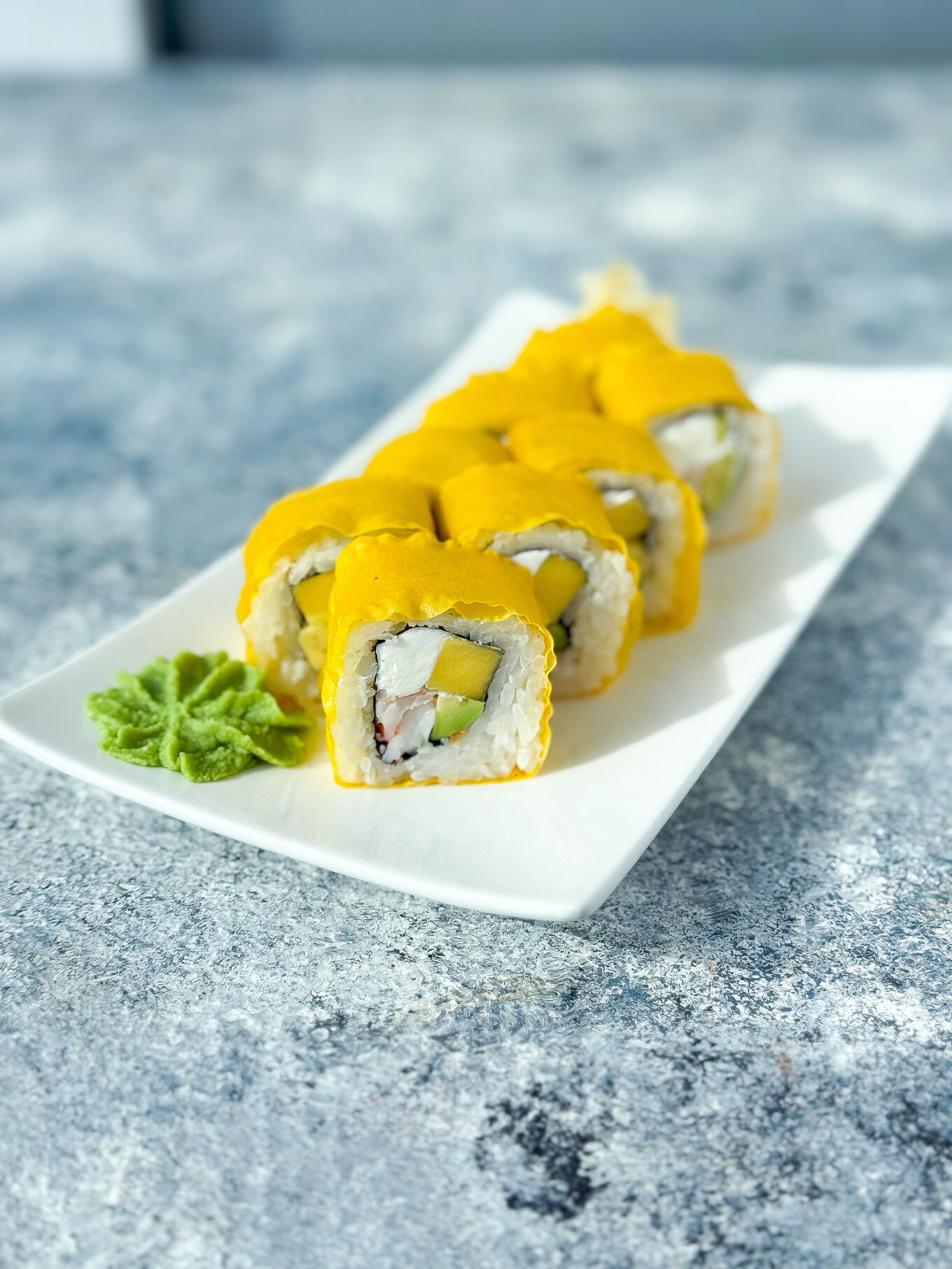 Ролл с креветкой, манго, авокадо и сливочным сыром в соевом листе