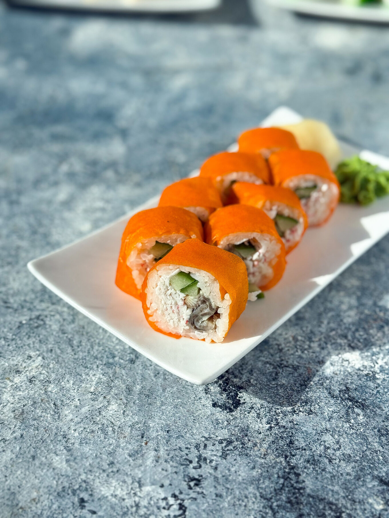 Ролл с угрем, снежным крабом и огурцом в соевом листе