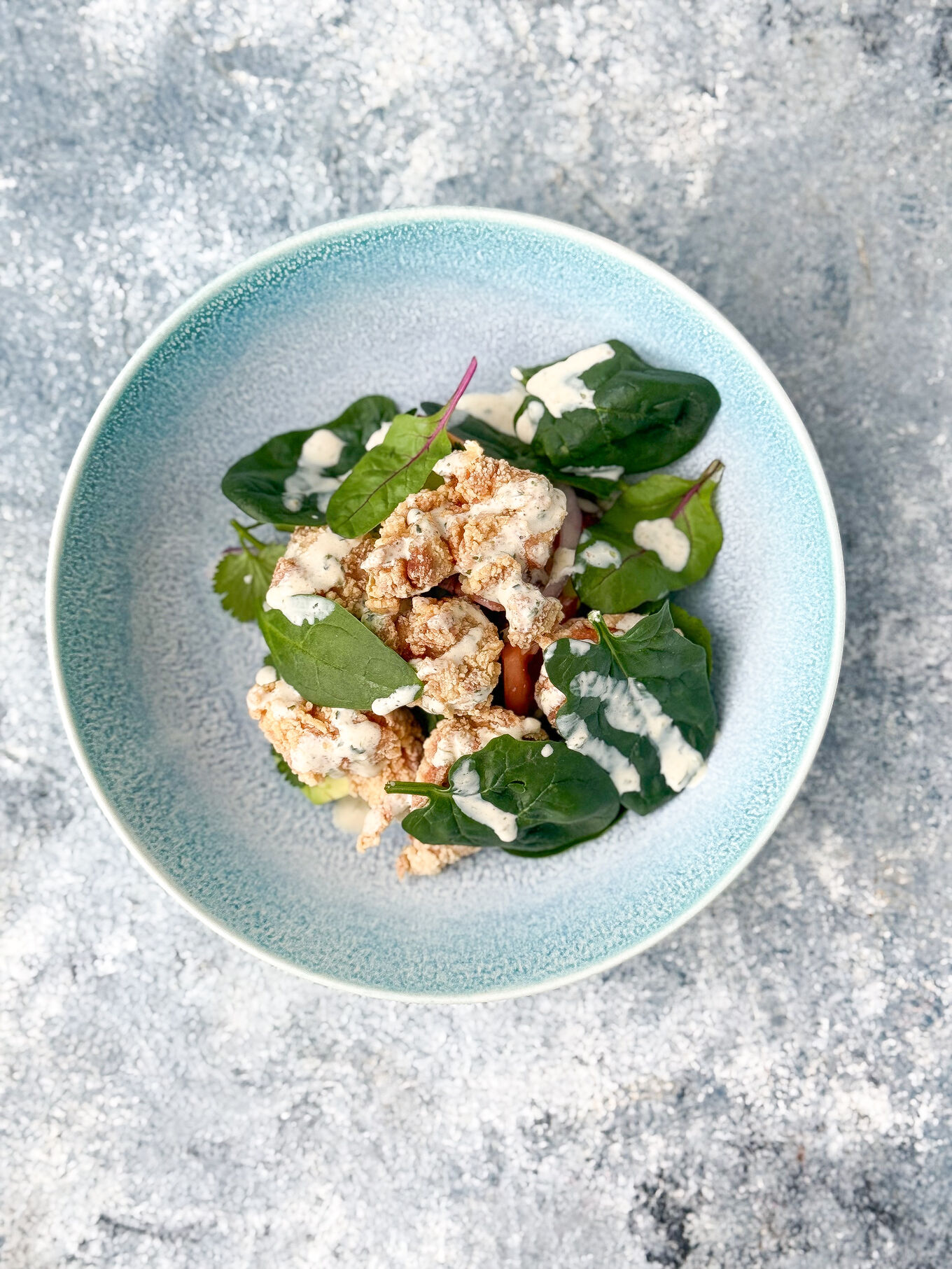 На порцию 200г: Ккал 330/ Белки 24,8/ Жиры 16,8 /Углеводы 20,2. Куриное бедро, помидоры, авокадо, йогурт натуральный, крахмал картофельный, лук красный, мангольд, шпинат мини,кинза, лайм, базилик зеленый, специи тандури, чеснок, лук, соль, мята, перец