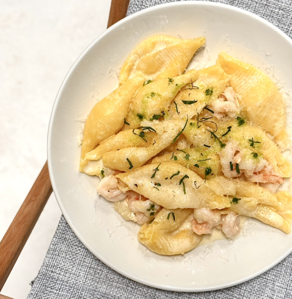 Состав: конкильони яичные, креветки тигровые, сливки 33%, бульон куриный, масло сливочное, сыр пармезан, петрушка, чеснок, лимон (цедра), соус чимичурри, соль, перец