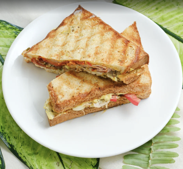 Состав: тостовый хлеб, сыр моцарелла, томаты розовые, чимичури - (петрушка, масло растительное, чеснок, соль), курица бедро, пепперони, окорок тамбовский, сливочное масло, соус релиш, майонез.