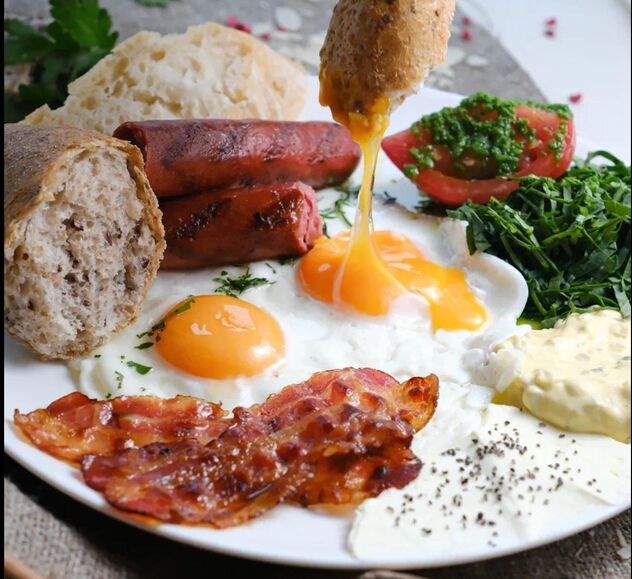 Состав: яйцо, молоко, сливки 22%, соль, масло сливочное, колбаски говяжьи халяль, соус релиш, масло сливочное, шпинат, салат с томатом и базиликом (томаты розовые, базилик, петрушка, мята, крем бальзамический, оливковое масло, соль, сахар, соус чимичури - петрушка, масло растительное, чеснок, соль), фокачча, черная соль, бекон сырокопченый