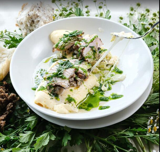Состав: яйцо, молоко, сливки 22%,соль, масло сливочное, сыр моцарелла, грибной паштет (лук репчатый, шампиньоны, масло сливочное, соль, сливки), петрушка, пастрами, соус чимичури, масло трюфельное
