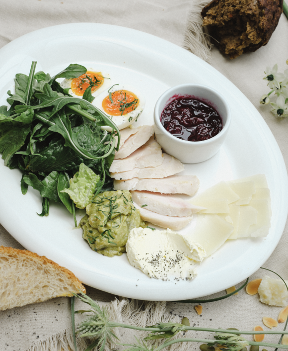 Яйцо 1 шт, хлеб тартин, гуакамоле, сыр эмменталь, масло сливочное взбитое , руккола, шпинат, тыквенные семечки, масло оливковое, джем в ассортименте, филе индейки су-вид