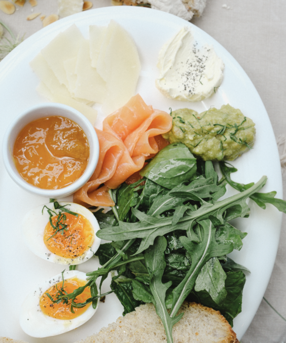 Яйцо 1 шт, хлеб тартин, гуакамоле, сыр эмменталь, масло сливочное взбитое , руккола, шпинат, тыквенные семечки, масло оливковое, джем в ассортименте, лосось слабосоленный