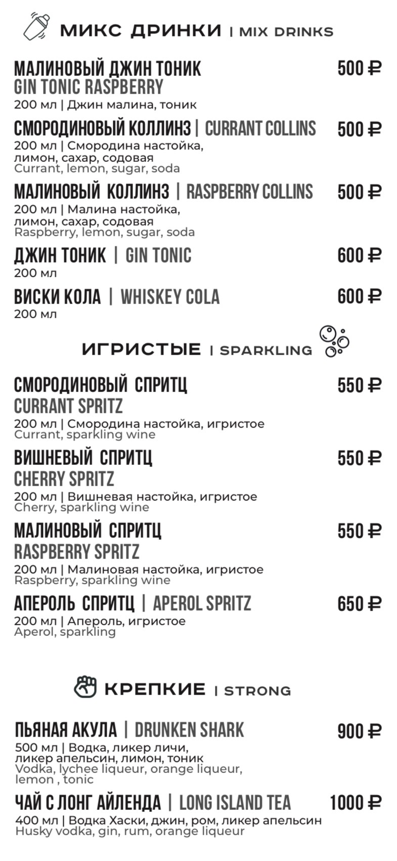 Объем коктейлей указан с учетом льда.