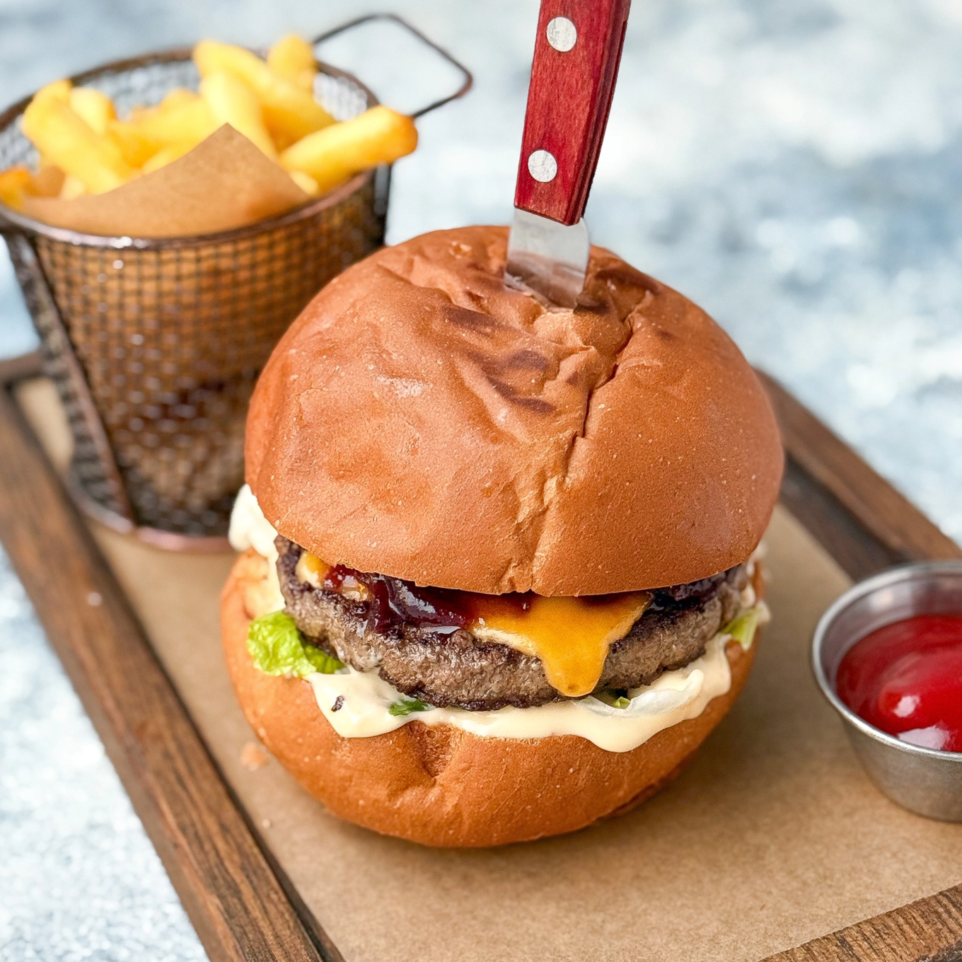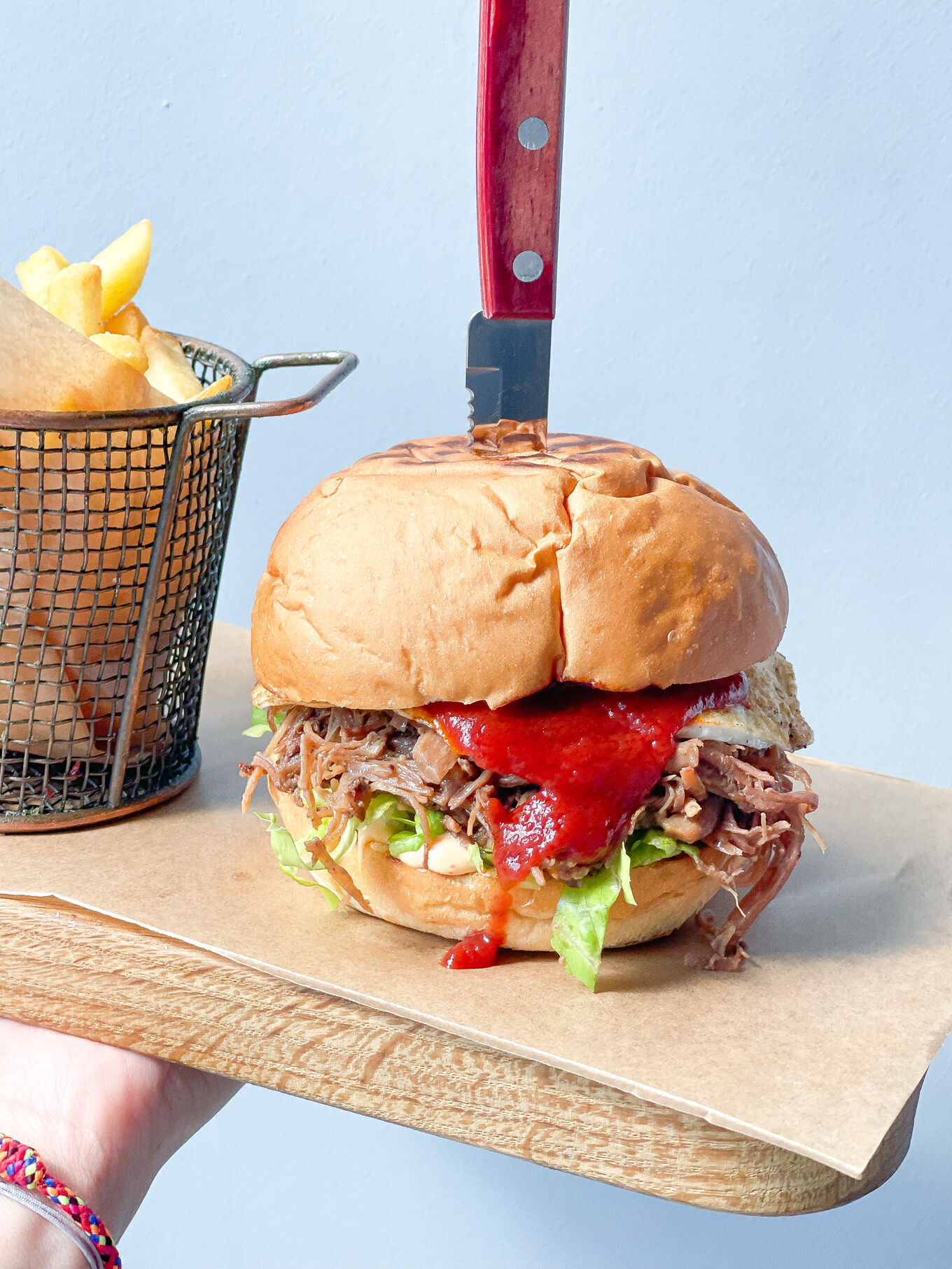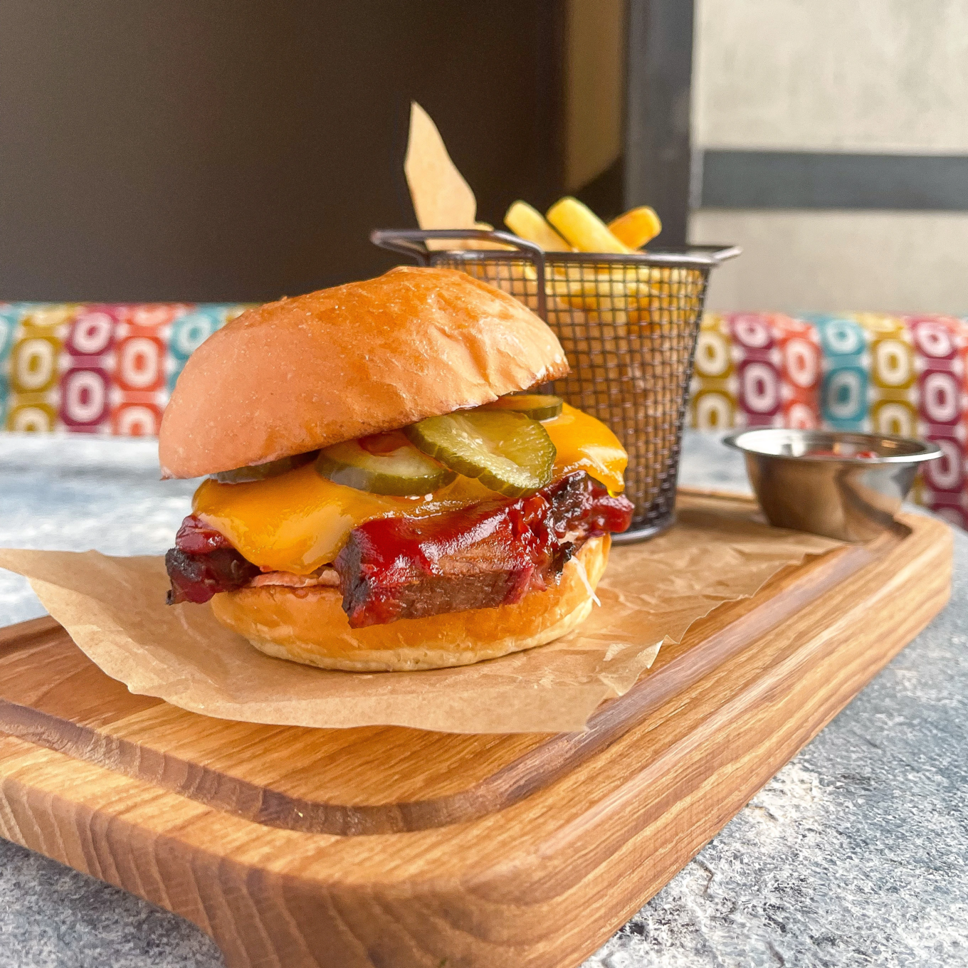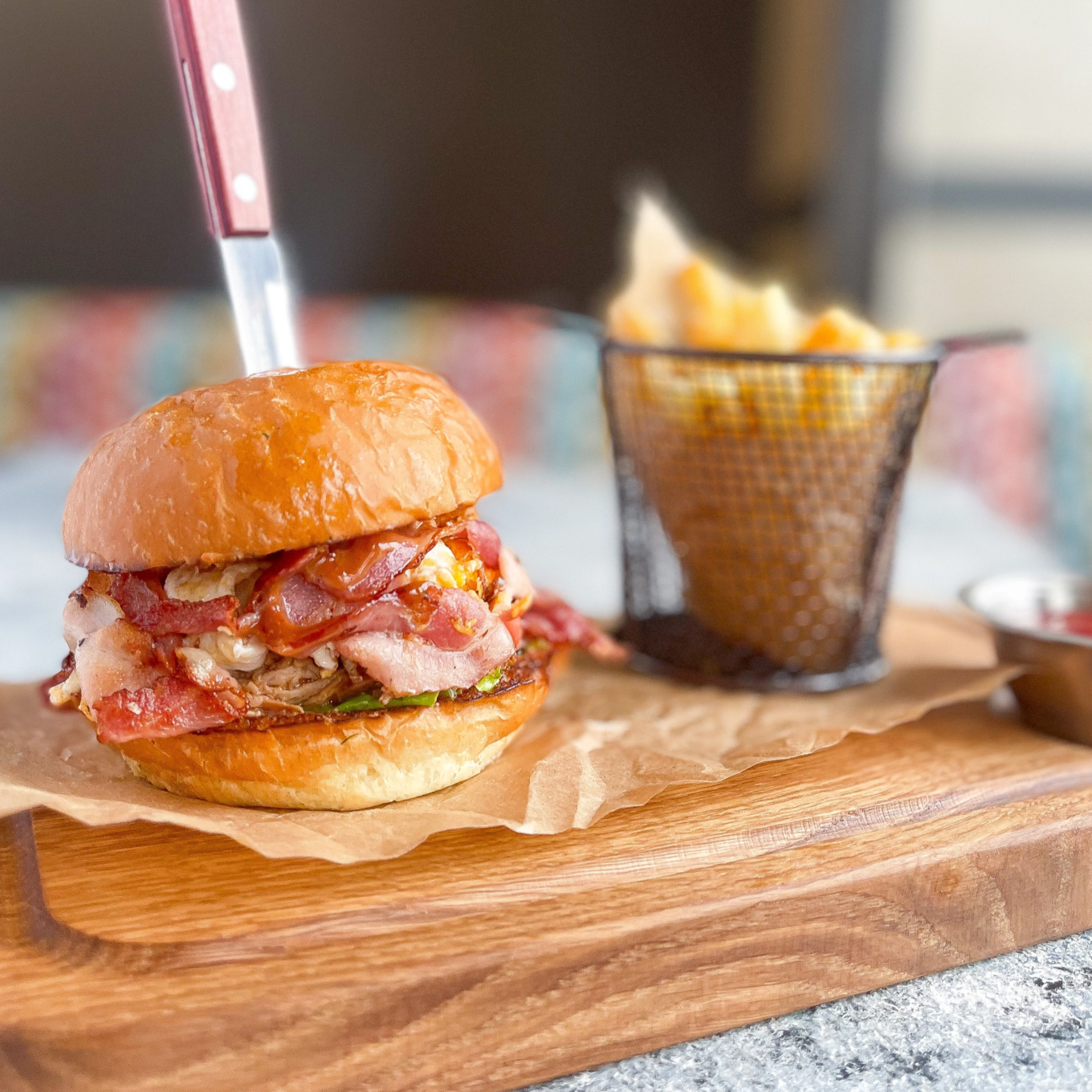 Бургер с рваной говядиной , соусом Барбекю и яйцом