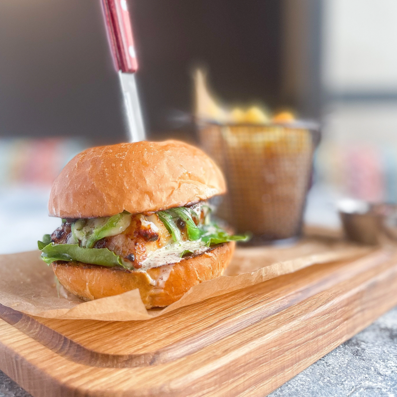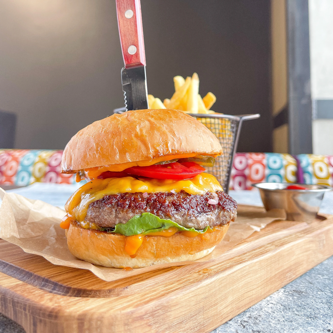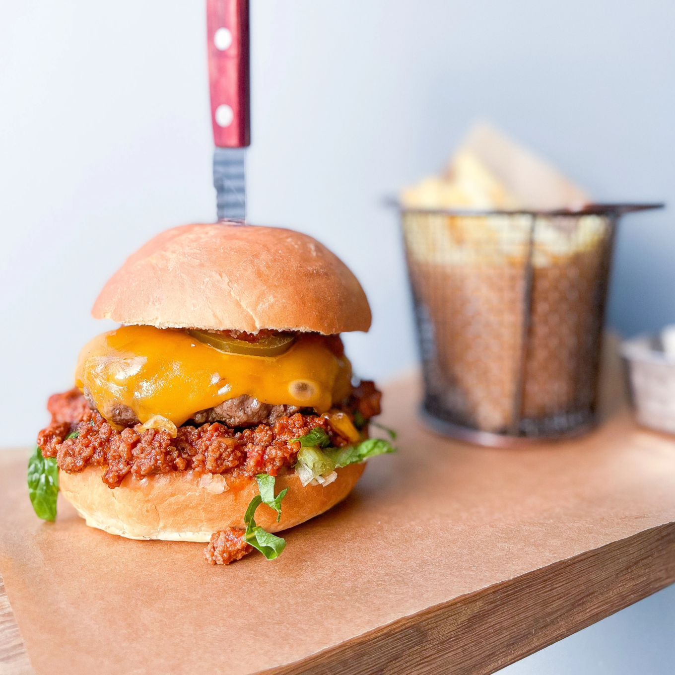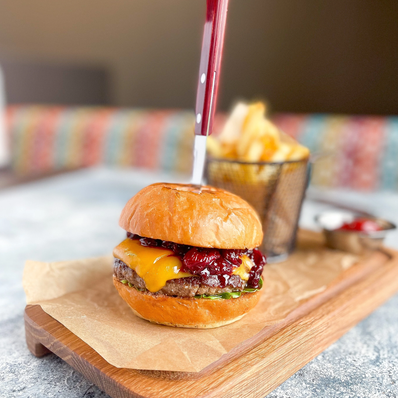 Бургер с рваной говядиной , соусом Барбекю и яйцом