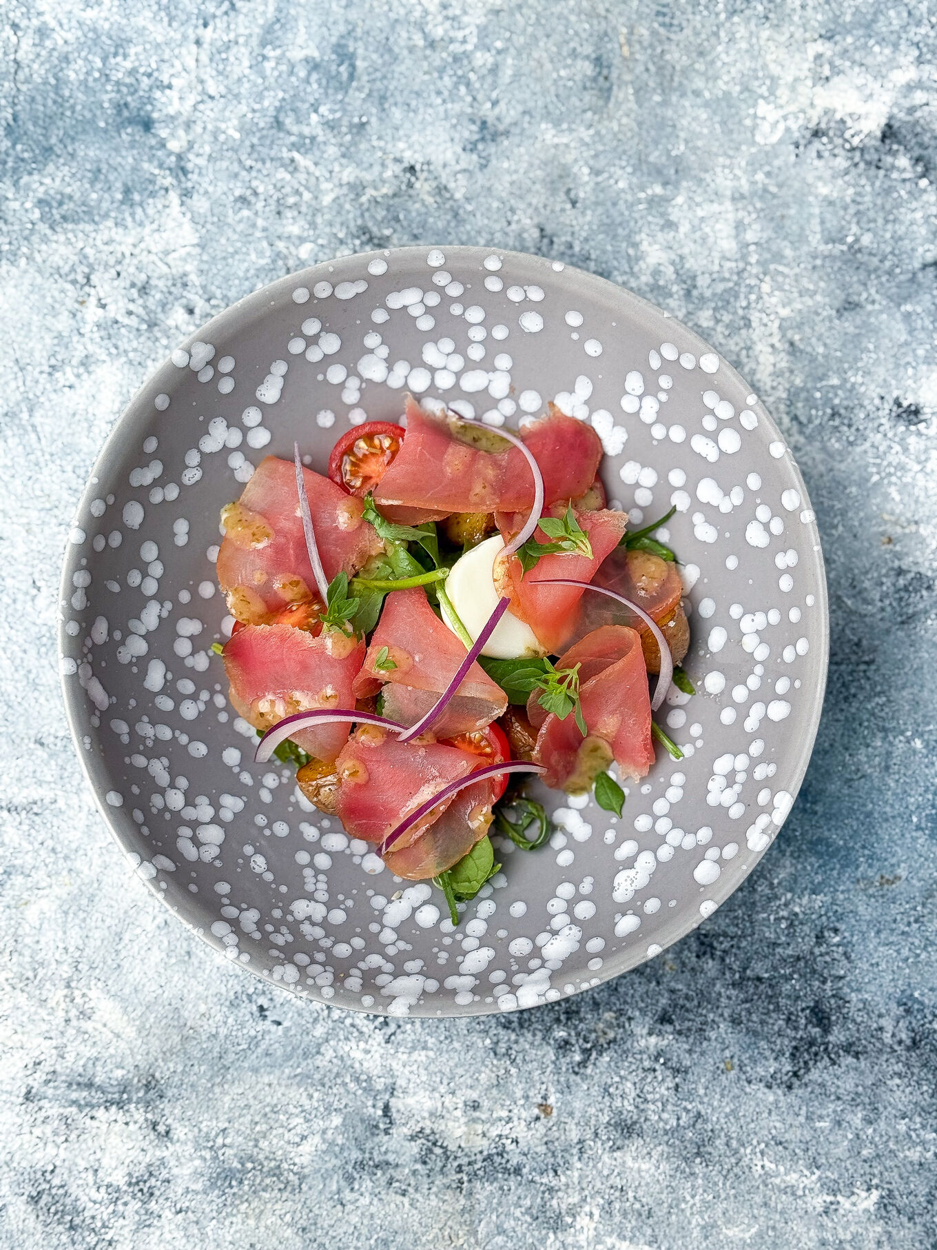 Салат с подкопченным тунцом , мини картофелем, зеленым салатом, яйцом и соусом на основе каперсов
