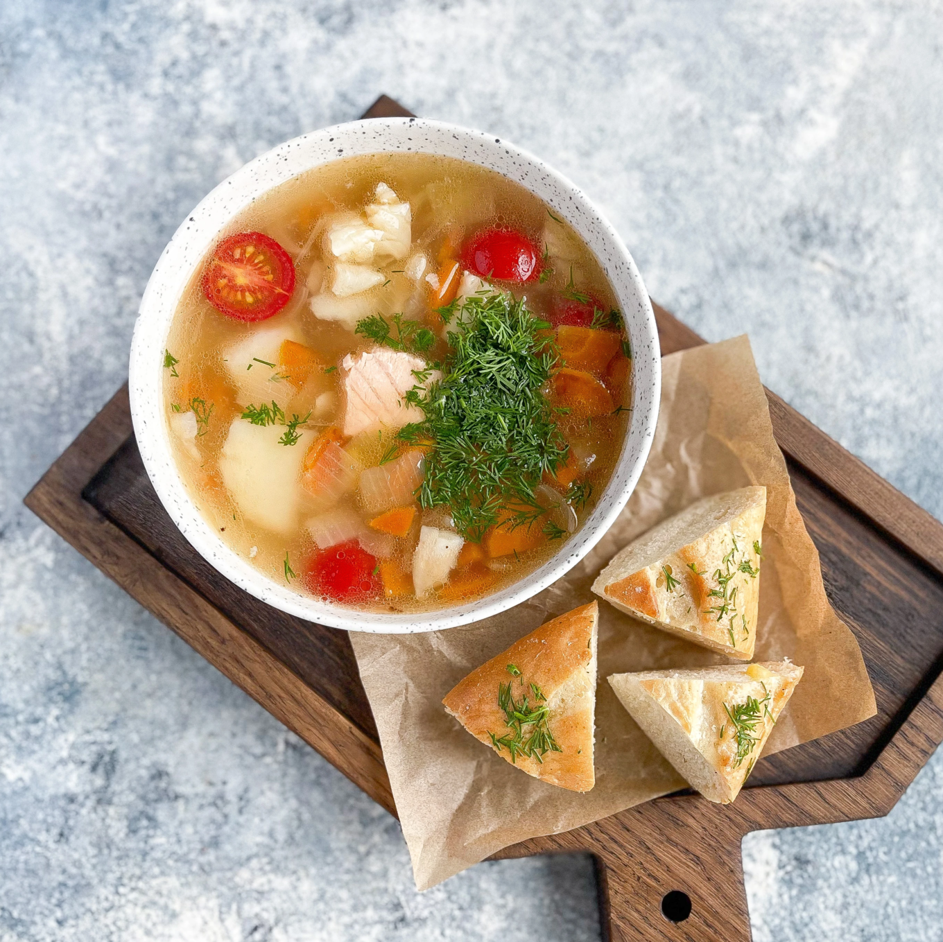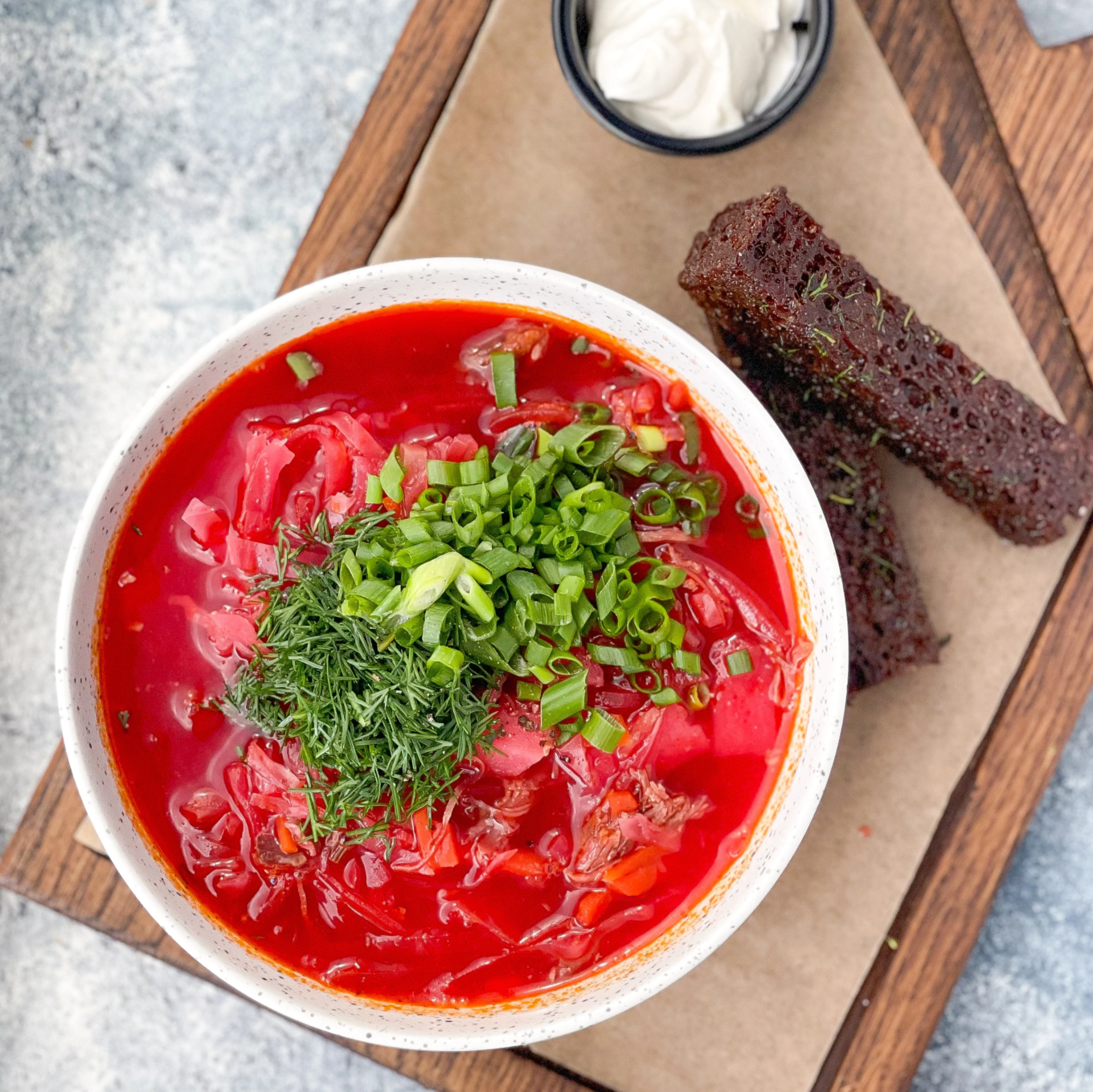 Борщ с рваной говядиной , копченой сметаной и чесночными гренками